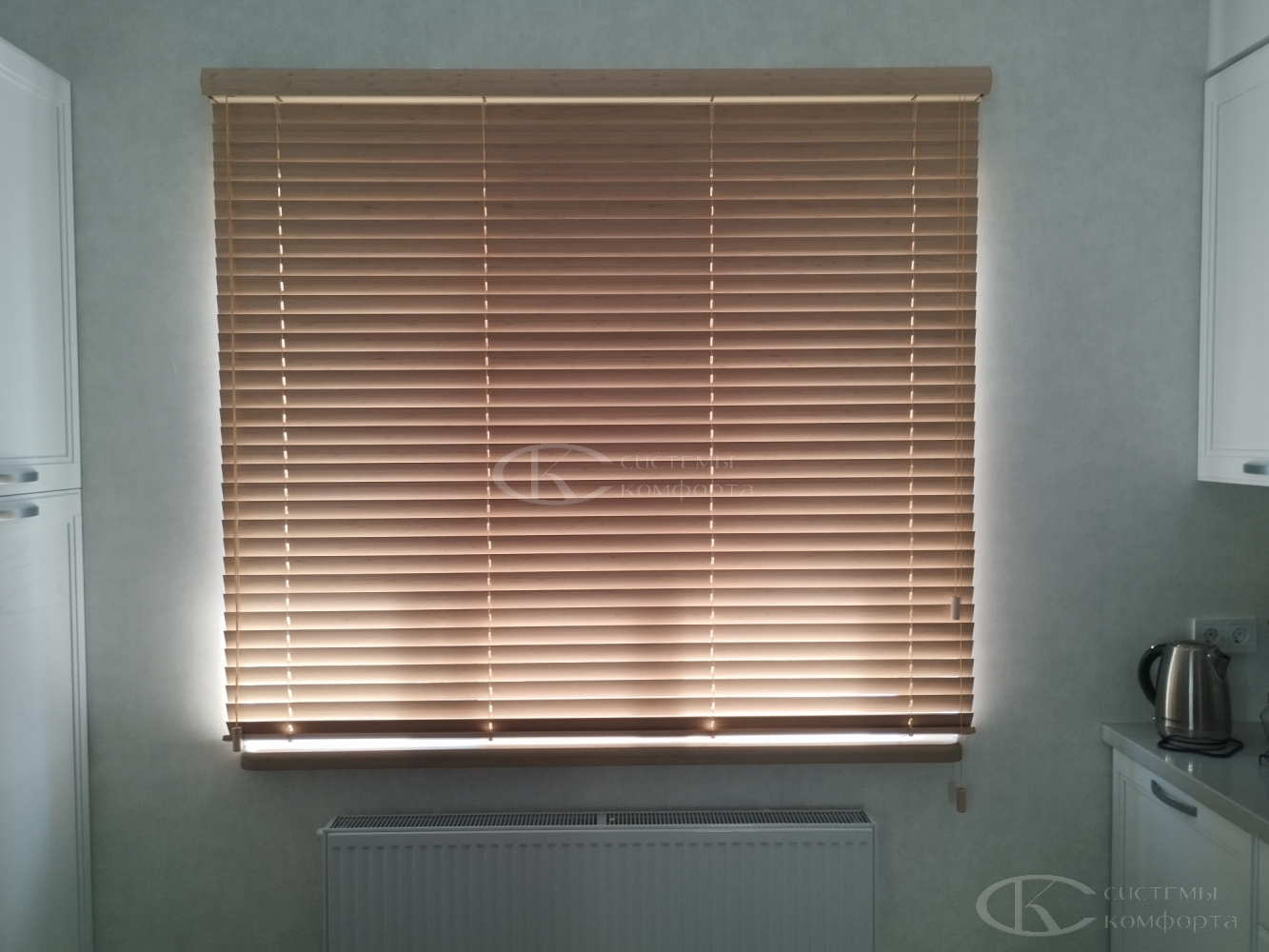 - Для мягкого, рассеянного света подходят полупрозрачные ткани или повернутые под углом ламели.